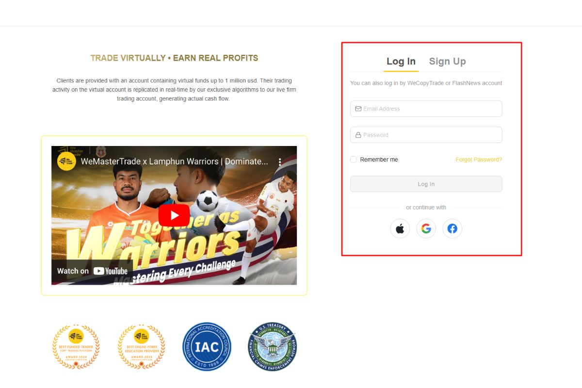 Create an account on the WeMasterTrade platform or log in to your existing account to access the user dashboard.