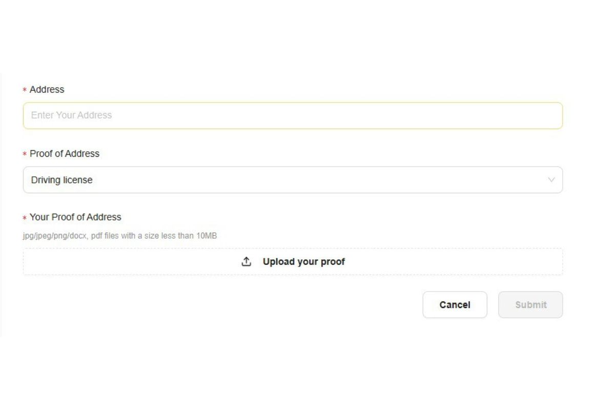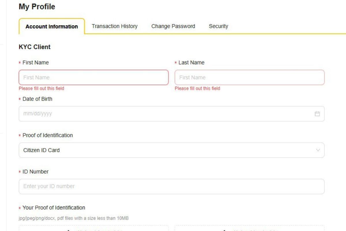 Fill out the compulsory section including first name, last name, date of birth, proof of identification (POI), ID number, your proof of identification (POI), address, proof of address (POA). There are some things you need to notice before submitting KYC: